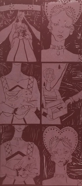 Following feedback from the group critique as well as the motivation of my personal aims for this project I decided to experiment with Lino printing to create imagery. I love the very strong lines created using this effect. As well as the variety of line and shape that can be created using different tools. I think it would be really interesting to see how far I could take this technique. Out of the four outcome choices available to me I had decided that the six illustration narrative would be best to visualise my concept. I want to create a short story showing my character’s dark ambition. The actual process of carving the lino was really fun, I found it a little challenging as once a line was made in the lino it could not be undone. However, this made me even more careful with my linework, making sure to make a perfect cut each and every time. This practice was really important, it allowed me to practice using line weight and get familiar with the tools I will be using to create my final outcome.